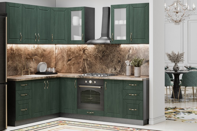 Táto moderná rohová kuchyňa kombinuje praktickosť a jednoduchý dizajn. Skrinky sa dajú poskladať v ľubovoľnom poradí a to vám umožní si zostaviť kuchyňu podľa svojich predstáv. Korpus a sokel sú z kvalitnej LTD dosky vo farbe antracit, dvierka sú z dosky MDF hr. 16 mm vo farbe khaki. Úchyty sú bronzové.