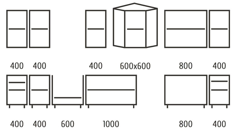 Zostava sa skladá zo spodných skriniek - výška 82 cm, hĺbka 47 cm, (s pracovnou doskou výška 85 cm, hĺbka 60 cm),šírka: - 40 cm skrinka 1-dverová - 2x 40 cm skrinka s tromi zásuvkami