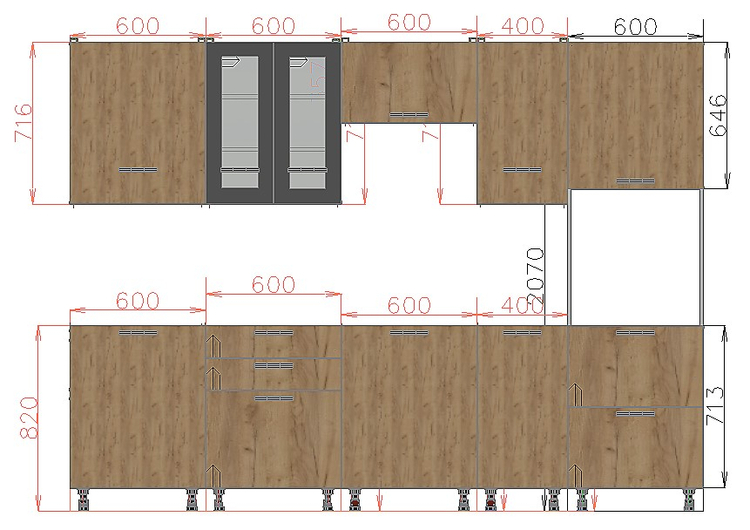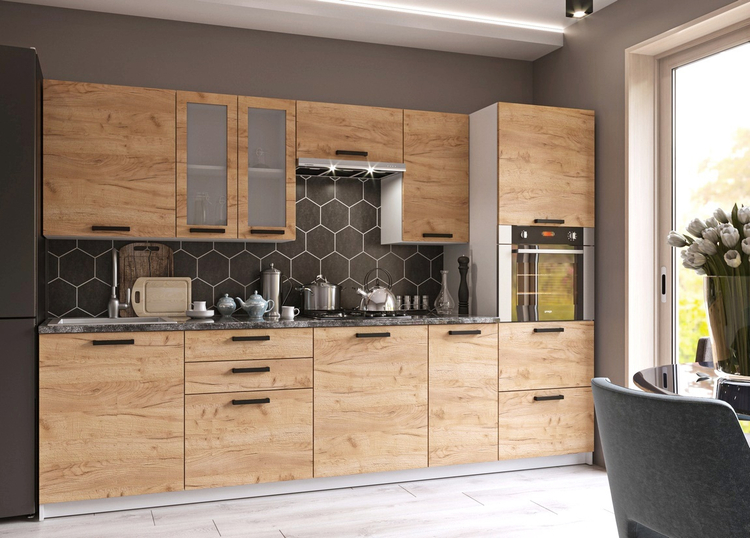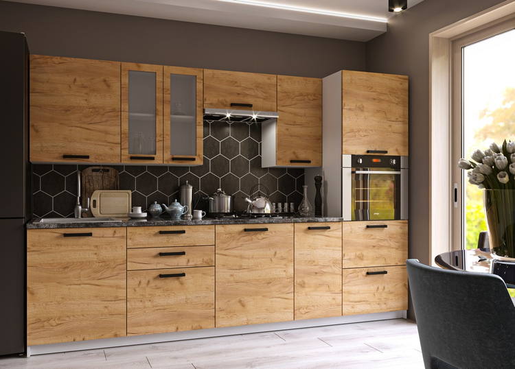 Moderná a lacná kuchyňa. Táto kuchyňa je navrhnutá tak, že skrinky sa dajú poskladať v ľubovoľnom poradí. To vám umožní si zostaviť kuchyňu podľa svojich predstáv. Korpus je vyrobený z kvalitnej LTD vo farbe biela, dvierka sú vo farbe dub kraft zlatý. Zásuvky majú modernejšie teleskopické výsuvy a nôžky kuchyne sú nastaviteľné. Pracovná doska a predný sokel nie je v cene. Spotrebiče, drez a digestor v cene tiež nie sú.