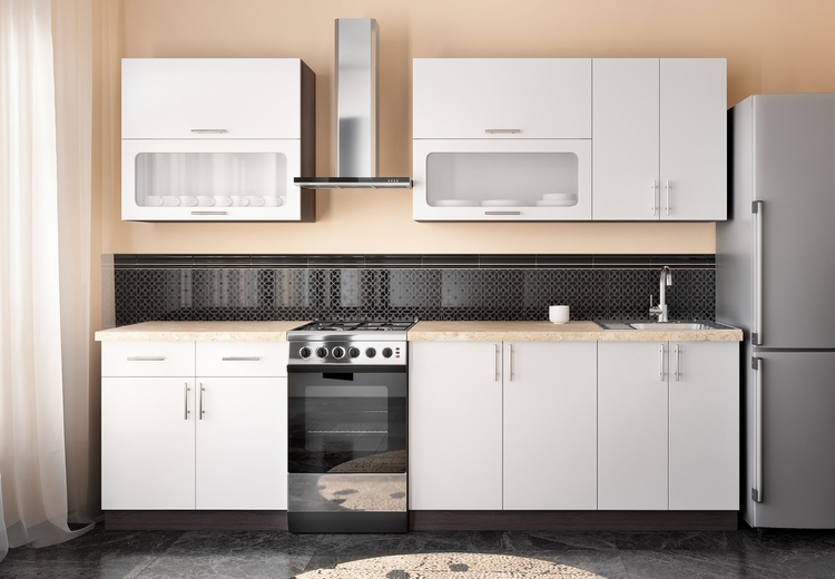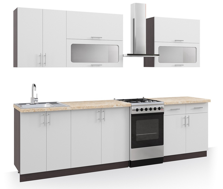 Táto moderná kuchyňa kombinuje praktickosť a jednoduchý dizajn. Skrinky sa dajú poskladať v ľubovoľnom poradí a to vám umožní si zostaviť kuchyňu podľa svojich predstáv. Korpus a sokel sú z kvalitnej LTD dosky vo farbe tmavej wenge, dvierka sú z MDF vo farbe biela supermat. Úchyty sú strieborné plastové.