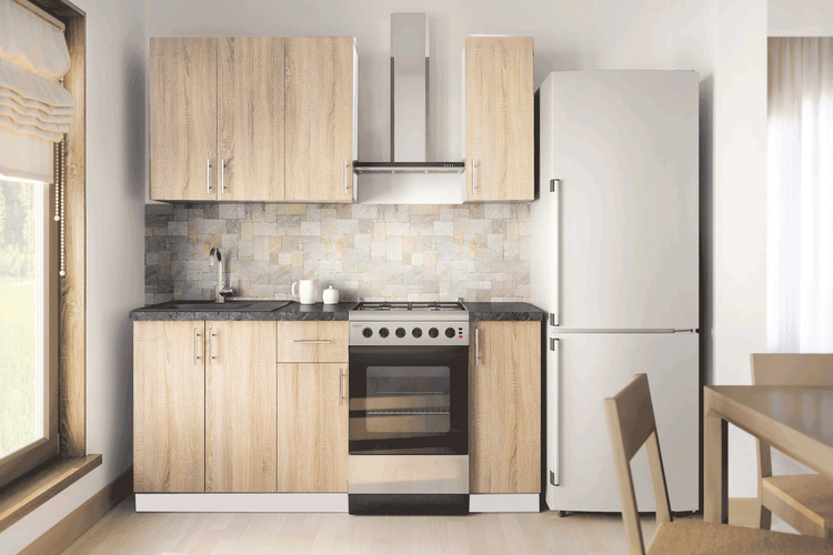 Táto moderná kuchyňa kombinuje praktickosť a jednoduchý dizajn. Skrinky sa dajú poskladať v ľubovoľnom poradí a to vám umožní si zostaviť kuchyňu podľa svojich predstáv. Korpus a sokel sú z kvalitnej LTD dosky vo farbe bielej, dvierka sú vo farbe dub sonoma. Úchyty sú strieborné plastové.