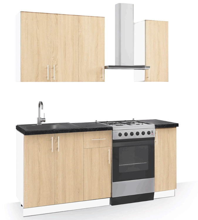 Táto moderná kuchyňa kombinuje praktickosť a jednoduchý dizajn. Skrinky sa dajú poskladať v ľubovoľnom poradí a to vám umožní si zostaviť kuchyňu podľa svojich predstáv. Korpus a sokel sú z kvalitnej LTD dosky vo farbe bielej, dvierka sú vo farbe dub sonoma. Úchyty sú strieborné plastové.... více informací o zboží