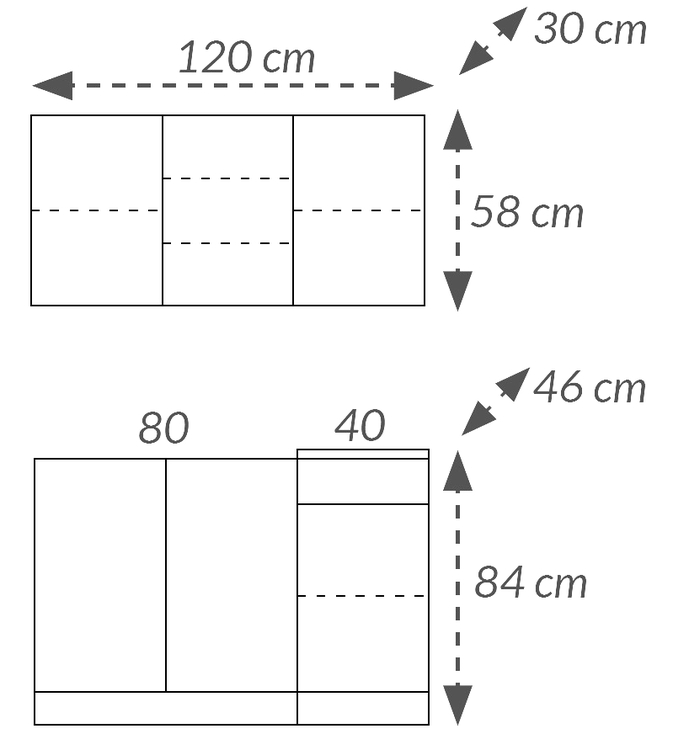 - šíri? ka 120 cm, výška 58 cm, hĺbka 30 cm. Po stranách sú dvoje? Ka, uprost? Ed praktické police.