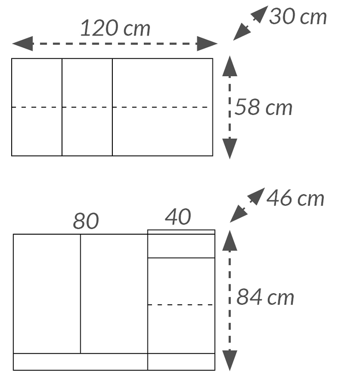 - šírka 120 cm, výška 58 cm, hĺbka 30 cm.