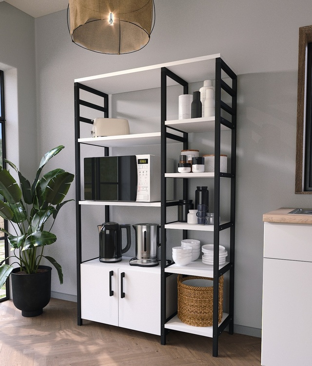 Praktický policový regál industriálneho štýlu je z kovového rámu v matnej čiernej farbe, dvierka a osem políc je vyrobené z kvalitnej LTD dosky. Farebné prevedenie dvierok a políc je matná biela. Dodávame v demontovanom stave.CASA 36005
