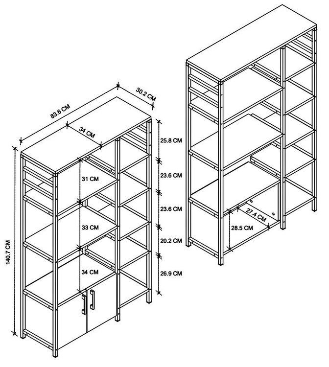 Policový regál je z kovového rámu v matnej čiernej farbe, dvierka a osem políc je vyrobené z kvalitnej LTD dosky vo farbe borovice. Dodávame v demontovanom stave.CASA 36005