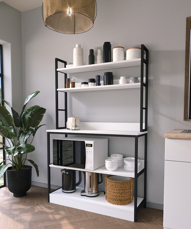 Praktický policový regál industriálneho štýlu vhodný nielen do kuchyne je z kovového rámu v matnej čiernej farbe a police sú vyrobené z kvalitnej LTD dosky. Farebné prevedenie políc je matná biela. Dodávame v demontovanom stave.CASA 36004