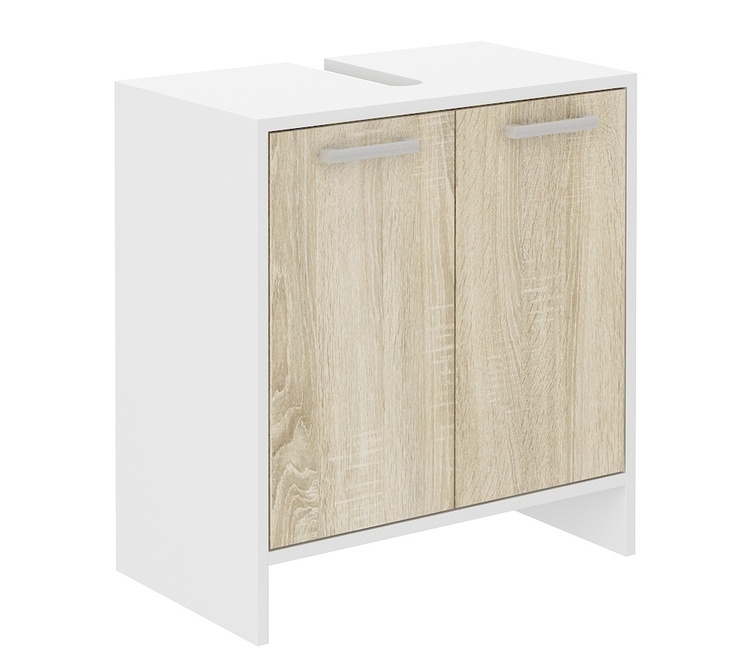 Zostava do kúpeľní, štýlová a zároveň vhodná do moderných interiérov. Korpus aj dvierka sú vyrobené z dosky LTD 16 mm potiahnuté PVC fóliou vo farbe biela/dvierka v dub sonoma. Zadná strana je zo sololitu. Úchyty sú plastové. Skladá sa (šxvxh) - 2-dverová skrinka pod umývadlo (60x60,5x32,6 cm),... více informací o zboží