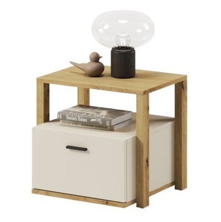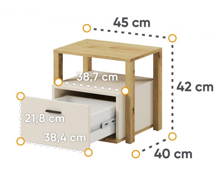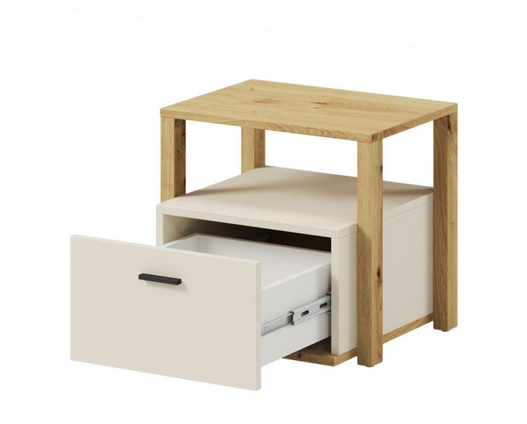 Nočný stolík s jednou zásuvkou a voľným priestorom. Viď obrázok. Tento sektorový nábytok nielen pre teenagerov pôsobí nielen príjemne, ale má aj svoj špecifický charakter. tiež nadčasovú.