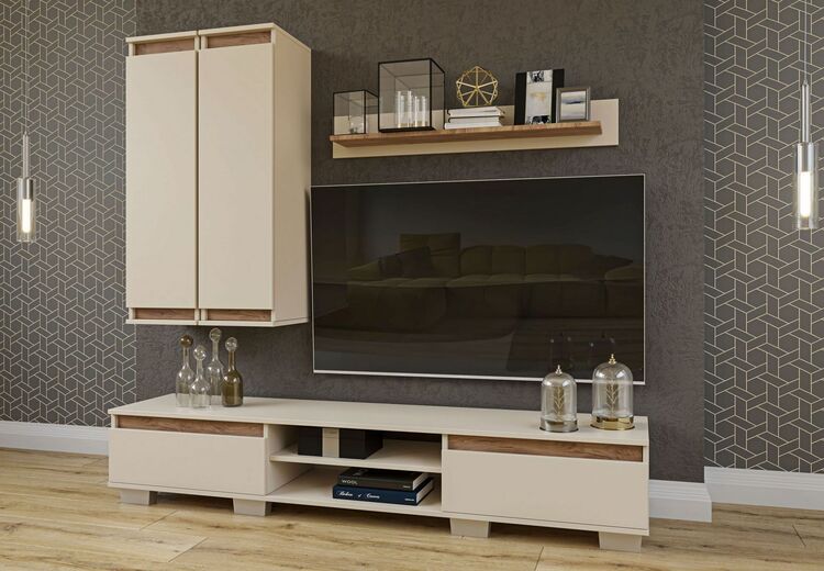 Lacná obývacia stena v modernom farebnom prevedení sa stane výrazným prvkom každej miestnosti. Kombinácia farby satin s dekoračnými lištami z MDF kraft duba tabac farby. Nábytok je vyrobený z kvalitného lamina hraneného melanínom. Zostava sa skladá z ( šírka / hĺbka / výška ) - televízny stolík s 2 zásuvkami ( 175,2 x 37 x 31 cm ),2x závesná skrinka 1-dverová ( 28 x 30,6 x 100,2 cm ) a police ( 98 ,2 x 16 x 15 cm). Táto stena sa predáva ako zostava, jednotlivé diely nemožno kúpiť zvlášť. Dodávame v demontovanom stave.CASA 83071