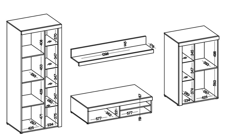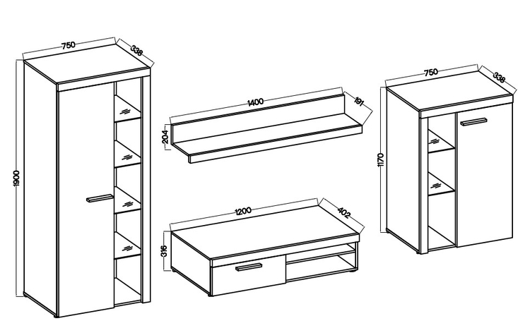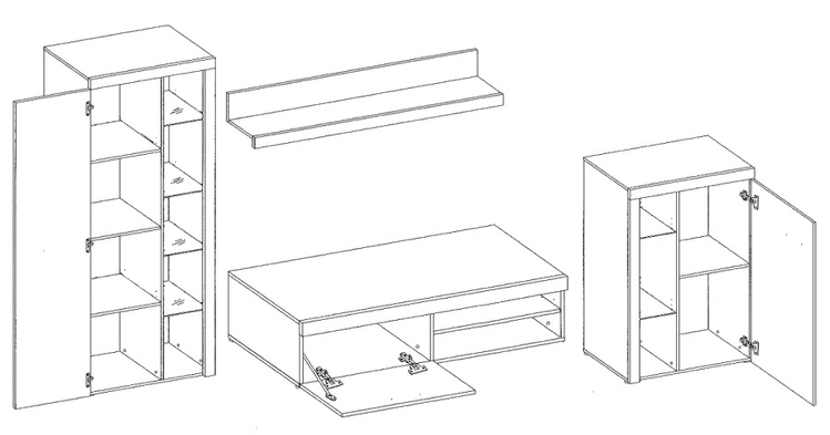 Moderná obývacia stena, ktorá si zakladá na najnovších trendoch bývania. Nábytok je vyrobený z kvalitného lamina. Zostava sa skladá z ( šírka / hĺbka / výška ) - TV stolík ( 120 × 40,3 × 31,5 cm ),vysoká vitrína ( 75 × 33,9 × 190 cm ),nízka vitrína ( 75 × 33,9 × 117 cm ) a... více informací o zboží