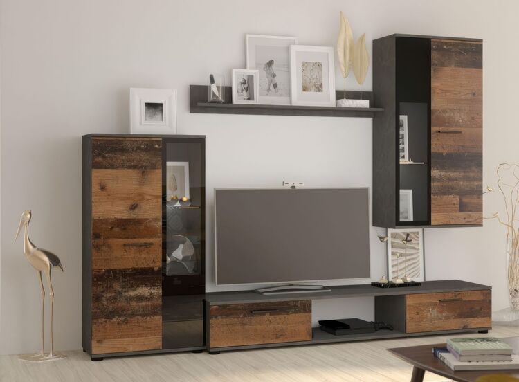 Moderná obývacia stena. Nábytok je vyrobený z kvalitného lamina. Zostava sa skladá z vitríny 59 × 31 × 115, TV stolíka 176 × 40 × 28, závesnej vitríny 59 × 31 × 113 a police 102 × 18 × 16 cm. Korpus je vo farbe dub old style, dvierka vo farbe matera (čiernošedá). Sklo vo vitríne je číre. Táto stena sa predáva ako zostava, jednotlivé diely nemožno kúpiť zvlášť. Možnosť doobjednania komody alebo LED osvetlenia. Dodávame v demontovanom stave.CASA 87009