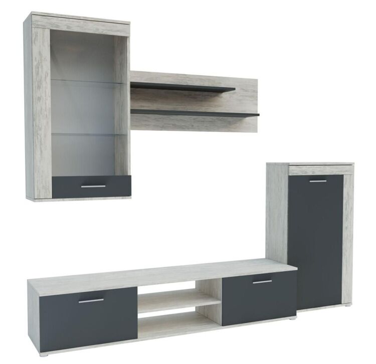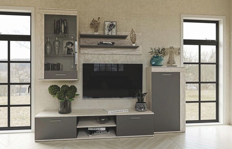 Moderná obývacia stena vhodná aj do menších bytov. Táto zostava je vyrobená z kvalitného lamina. Zostava sa skladá (šírka/výška/hĺbka ) - TV stolík (180 × 36 × 42 cm),vitrína ( 60 × 109 × 30,5 cm),komoda (60 × 111 × 30,5 cm) a police ( 110 × 40). Korpus a časť predných dvierok je farby dub artwood, dvierka sú doplnené o farbu grafit grey. Táto stena sa predáva ako zostava, jednotlivé diely nemožno kúpiť zvlášť. Pri vitríne je možnosť dokúpenia LED osvetlenia. Dodávame v demontovanom stave.CASA 83023