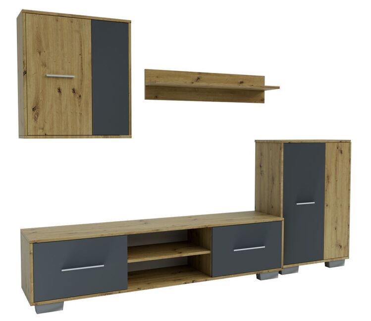 Moderná obývacia stena vhodná aj do menších bytov. Táto zostava je vyrobená z kvalitného lamina. Zostava sa skladá (šírka/výška/hĺbka) - TV stolík (160 x 39 x 38 cm),nástenná skrinka (60 x 67 x 22 cm),komoda (60 x 89 x 30 cm) a police (90 x 19 x 1 cm ). Korpus a časť predných dvierok je farby dub artisan, dvierka sú doplnené o farbu šedý grafit. Táto stena sa predáva ako zostava, jednotlivé diely nemožno kúpiť zvlášť. Dodávame v demontovanom stave.CASA 83032