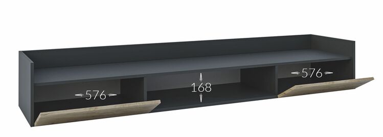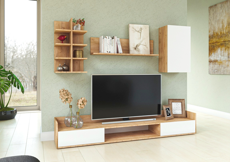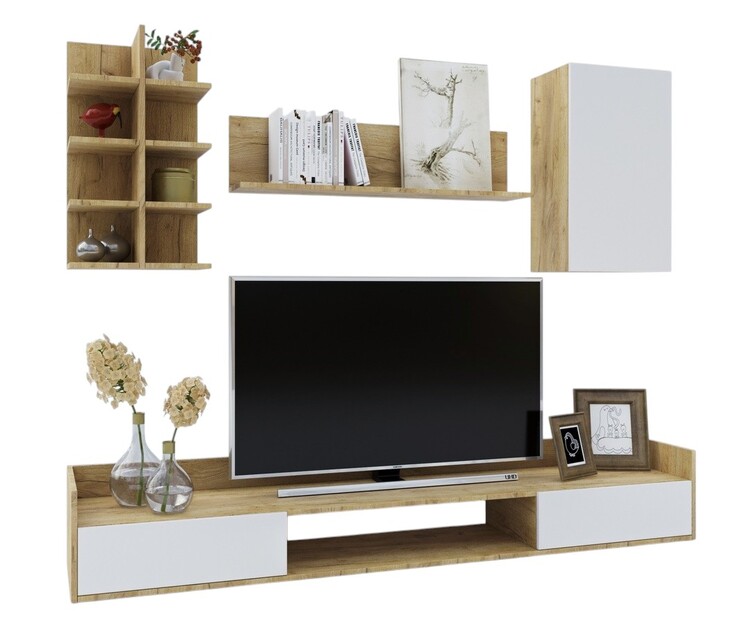 Priestranná obývacia zostava v jemných prírodných tónoch. Nábytok je vyrobený z kvalitnej dosky LTD, korpus je vo farbe dub kraft zlatý, dvierka sú vo farbe matná biela (nymphaea albumu). Zostava sa skladá z týchto položiek ( Š x V x H ) - televízny stolík s 2 výklopnými dvierkami ( 200 x 30 x 40 cm),závesná skrinka s 1 policou vo vnútri ( 40 x 70,1 x 30 cm ),závesný regál ( 40 ,1 x 70,1 x 27,7 cm) a police (100,1 x 25,1 x 19,6 cm). Dodávame v demontovanom stave.CASA 83076