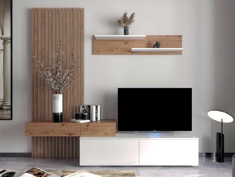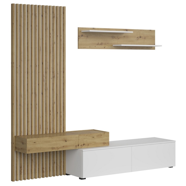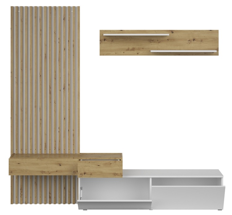 Obývacia stena sa bude hodiť najmä do obývacej izby zariadenej do moderného či škandinávskeho štýlu. Prezentovaná nábytková zostava je kombináciou estetického designu a funkčnosti. Štýlový lamelový panel bude ozdobou každého interiéru a skvele dopĺňa stenu s TV stolíkom a policou. LTD s hrúbkou 16 mm a 22 mm, zadná časť nábytku je vyrobená z drevovláknitej dosky s hrúbkou 3 mm, pánty Hettich, HAFELE celovýsuvné guličkové vedenia, plastové nohy, bezúchytový systém "PUSH TO OPEN". Farebné prevedenie - biela mat/dub Artisan. Dodávame v demontovanom stave.CASA 94001