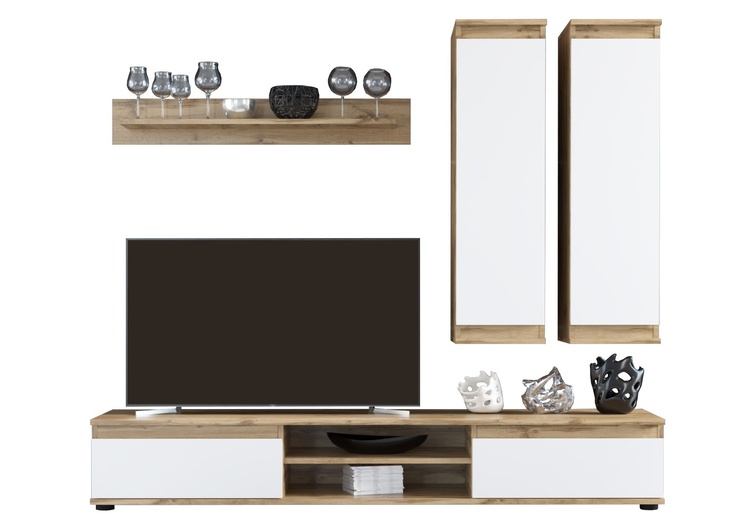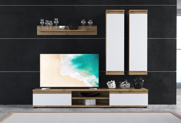 Obývacia stena sa vyznačuje štýlovým dizajnom a moderné farebné prevedenie ozdobí vašu obývaciu izbu. Zostava sa skladá - televízny stolík- výška/šírka/výška - 29/175/37 cm (dvoje výklopné dvierka),police - šírka - 99 cm a 2x závesné skrinky - výška/šírka/výška - 100/30/28 cm (vnútri dve police). Farebné prevedenie - dub tahoe/biela matná (Nymphea albumu). Dodávame v demontovanom stave.CASA 94009