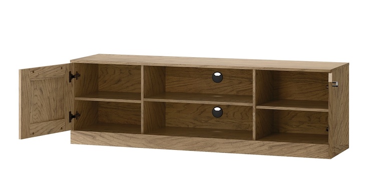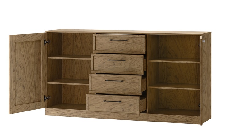 Zostava do obývačky v nadčasovom prevedení. Korpus je vyrobený z prírodnej dyhy vo farbe dub rustikálny, dvierka sú vyrobené z masívu v kombinácii s prírodnou dyhou v zaujímavom dekore rybia kosť v prevedení dub rustikálne olejovaný. Zostava sa skladá z týchto položiek (Š x V x H cm) - komoda 2D4S (170 x 90 x 42 cm),2x závesná polica (140 x 22 x 22 cm),televízny stolík (160 x 50 x 42 cm) a komoda s regálom (100 x 140 x 50 cm). Úchyty sú kovové vo farbe čierna mat. Dvierka a zásuvky disponujú systémom tichého dovierania. Dodávame už v zmontovanom stave, police sú dodávané v demontovanom stave.CASA 75098