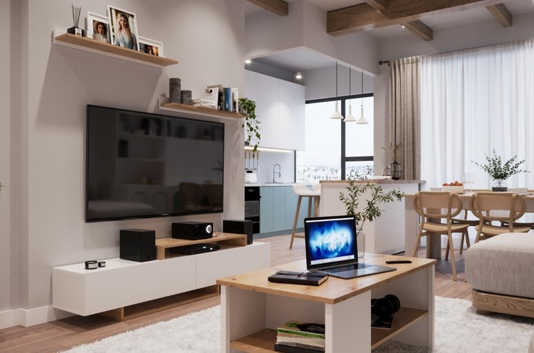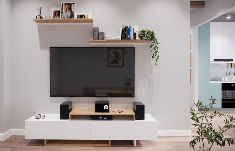 Predstavujeme Vám mini obývaciu stenu. Navrhnutá je tak, aby povýšila váš obytný priestor svojou elegantnou estetikou a praktickými úložnými riešeniami. Farebné prevedenie je biela mat/dub Artisan. Zostava obsahuje - televízny stolík a 2 ks závesných políc. Vyrobená je z vysoko kvalitných LTD 22 mm/16 mm pre životnosť a stabilitu. Dodávame v demontovanom stave.CASA 94013