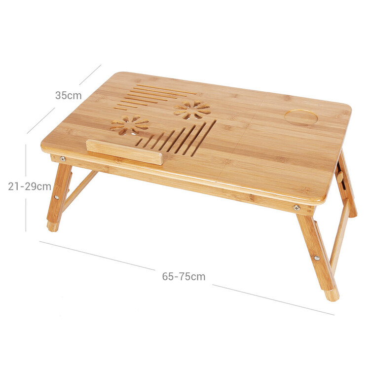Odkladací stolík na notebook z bambusu ponúka praktické a estetické riešenie na prácu i odpočinok. Doska je rozdelená na dve časti, z ktorých jedna je nastaviteľná do rôznych uhlov a opatrená vetracími otvormi pre lepšie chladenie zariadenia, doplnená o zarážku proti skĺznutiu. Druhá časť slúži ako pevná plocha s výrezom na umiestnenie šálky alebo drobných predmetov. Pevné sklápacie nohy umožňujú ľahké prenášanie a skladovanie, pričom bambusové prevedenie zaisťuje stabilitu a prírodný vzhľad. Stolík je ideálny na použitie v posteli, na pohovke alebo na podlahe, pričom jeho rozmery a nosnosť zodpovedajú bežným potrebám domáceho i kancelárskeho využitia.