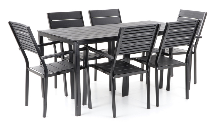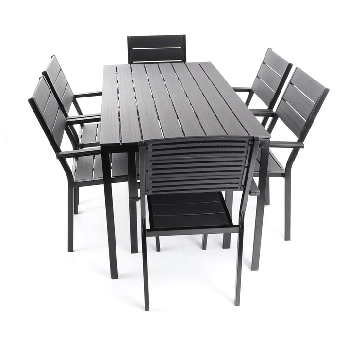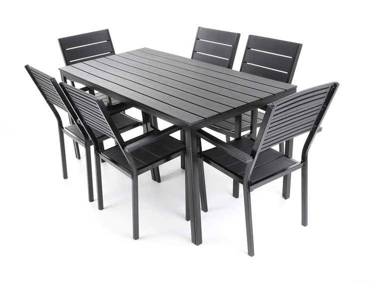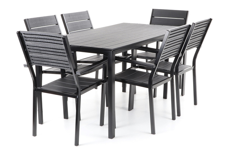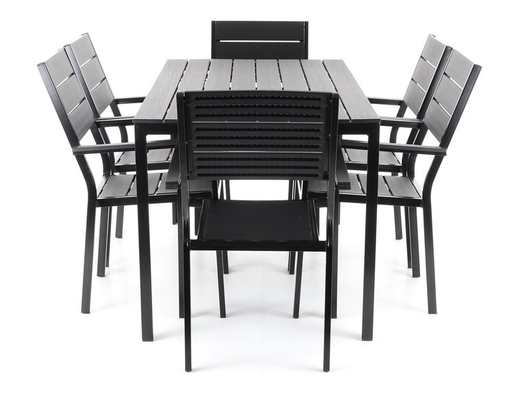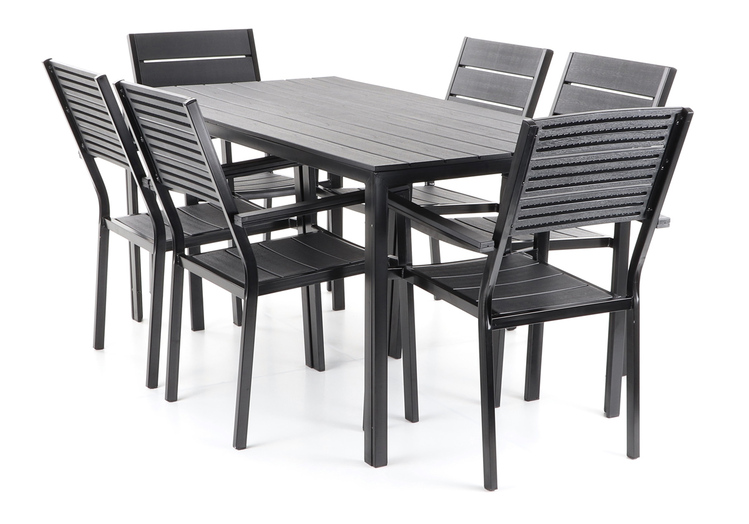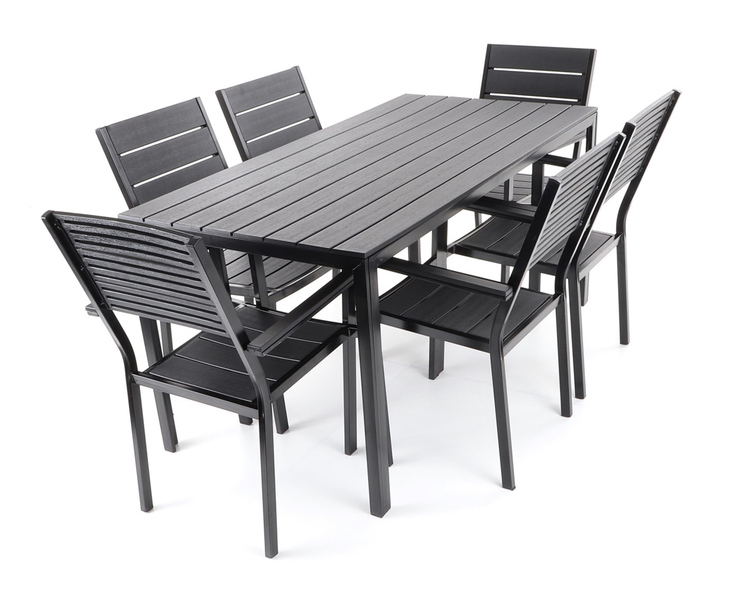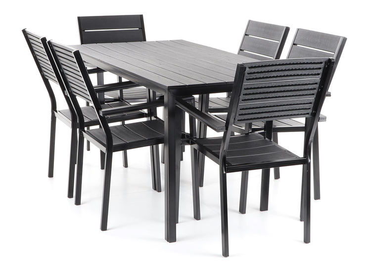 Stolová zostava PALERMO SET 6 Rozm? Very: Stolička: 55x44x80 cm St? L: 160x75x72 cm Stolová zostava skladajúca sa z 6-tich k? Esel z oceľových profil? , Povrchov? dokon? ená komaxitovou farbou. ? ALÚNENÉ? Nej je v imitácii masívneho d? Eva z lisovaného plastu s UV filtrom. Stolová zostava je ur? Ená do interiér ?, exteriér? a pergolových priestor. St? L je zhotovený z oceľových profil? povrchov? dokon? en komaxitovou farbou. Doska stola je v imitácii masívneho d? Eva z lisovaného plastu s UV filtrom.