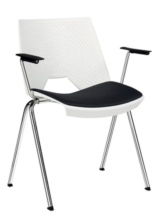 Moderná plastová stolička lastúrového tvaru, čalúnený sedák, oceľová chrómovaná konštrukcia, možnosť stohovania (max. 10 kusov),možnosť podrúčok alebo podrúčiek so sklopným stolíkom pre pravákov aj ľavákov, nosnosť 120 kg, záruka 36 mesiacov. Uvedená cena je bez podrúčok