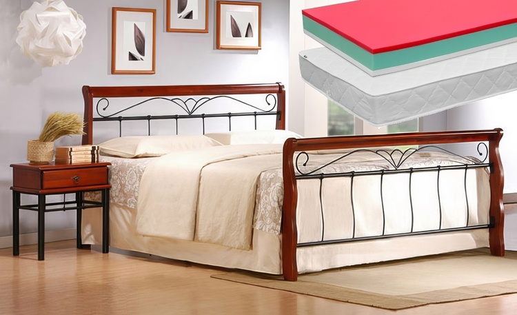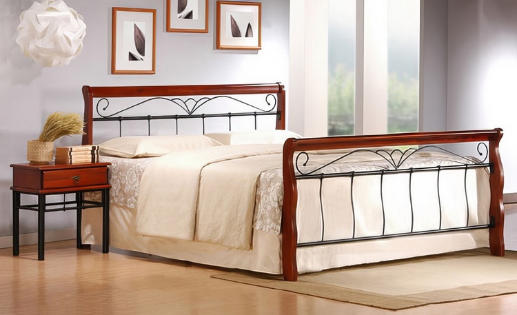 elegantná posteľ v klasickom štýle. Zaujímavá kombinácia kovu a dreva. Kvalitné masívneho drevo je vo farebnom prevedení antická čerešňa. Rám je kovový, tak ako aj originálne mreže v čiernej farbe na prednom aj zadnom čele. Pozdĺžne drevené lamely pri rošte sú vsadené do kovového rámu postele, pod roštom sú 3 podperné nožičky pre zvýšenie nosnosti (180 kg). Záťaž postele je cca 100 kg na každej strane postele. Výška roštu od zeme cca 34 cm. Dodávame demontovanom stave.CASA 95234+63015