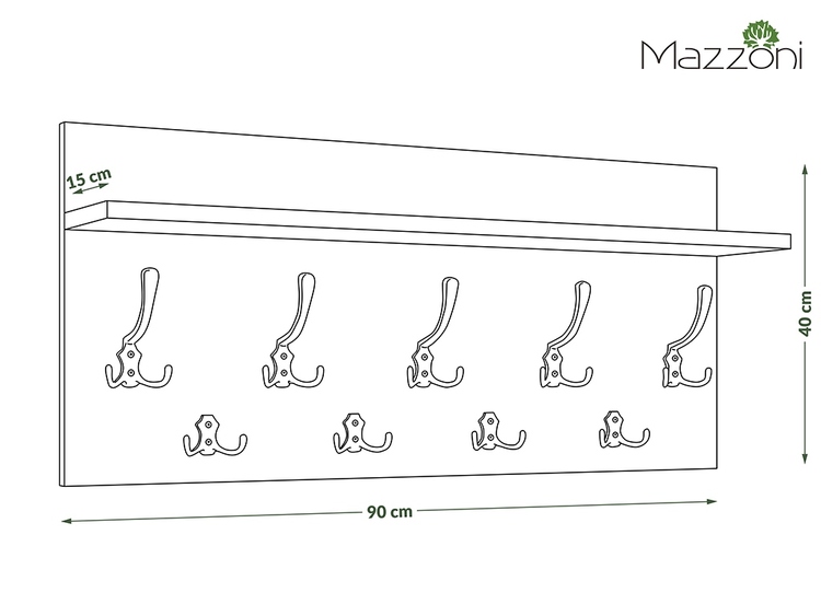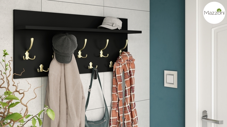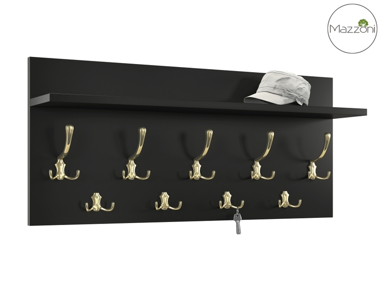 Elegantný vešiak s praktickou policou zaujme dostatkom kovových vešiakov (zlatá lesk) pre väčšie množstvo oblečenia. Je vyrobený s kvalitnou LTD 18 mm. Farebné prevedenie je matná čierna.