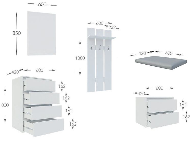 Predsieňová stena vyrobená z kvalitnej laminátovej dosky vo farebnom prevedení - chinchilla grey. Zostava sa skladá (š/v/h) - panel s vešiakom (60 x 138 x 23,2 cm),komoda so zásuvkami (60 x 80 x 42 cm),botník so zásuvkami (60 x 40 x 42 cm) a zrkadlo (60 x 85 cm). Ďalšie rozmery viď perokresba.... více informací o zboží