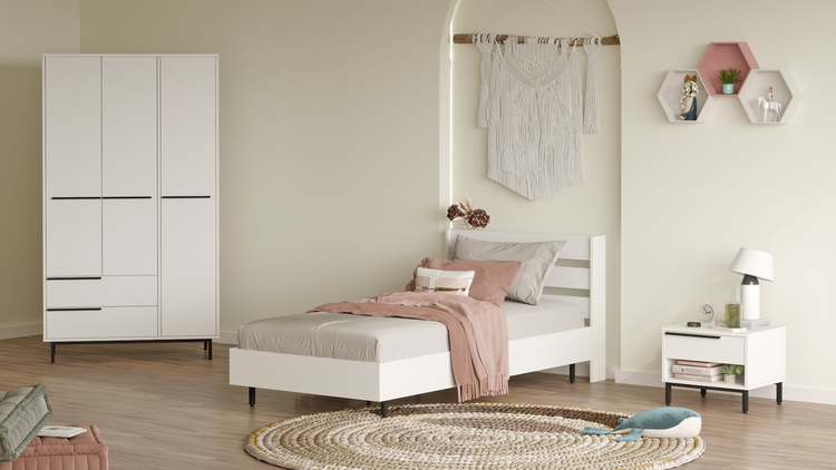 ponúka všetko, čo vaše dieťa potrebuje. Jednolôžková posteľ poskytuje pohodlný priestor na oddych, nočný stolík je ideálny pre knihy, lampičku alebo drobnosti, a priestranná šatníková skriňa zaistí dokonalú organizáciu oblečenia. Elegantný dizajn a praktické usporiadanie zaistí, že táto zostava zapadne do každej detskej izby.