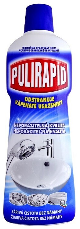 Neporaziteľná kvalita v boji proti vodnému kameňu, hrdzi a zvyškom mydla. Pulirapid obsahuje zmes účinných kyselín, ktoré odstráni všetku špinu. Čistí do vysokého lesku a odstraňuje vápenaté usadeniny, stopy mydla a hrdze v kuchyni, kúpeľni a na veľkých povrchoch. Oplachuje sa. Upozornenie: Dráždi oči a pokožku. Používajte biocídy bezpečným spôsobom. Pred použitím si vždy prečítajte etiketu a informácie o prípravku.