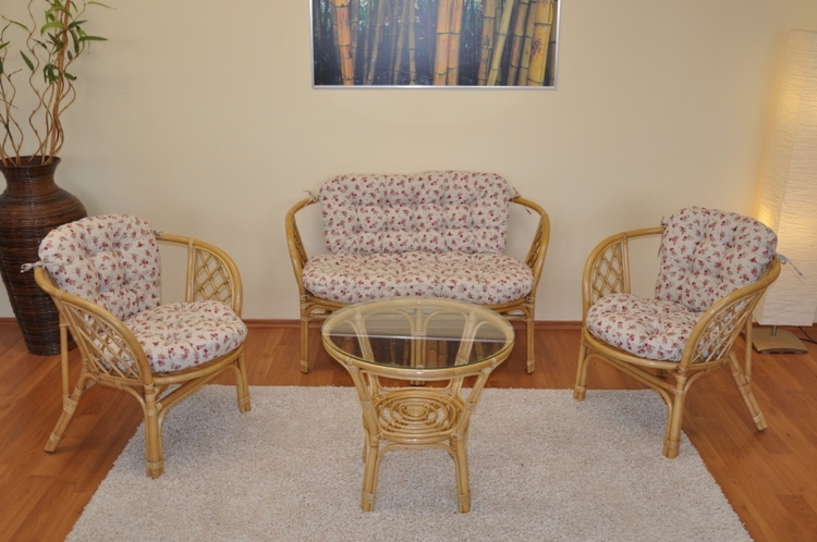 Ratanový nábytok – ratanová sedacia súprava Bahama je vyrobená z prírodného ratanu s farbou konštrukcie v medovom odtieni. Súprava obsahuje pohovku, 2 kreslá, stolík so sklom a kompletnú sadu polstrov vyrobených v Českej republike. | Farba ratanovej konštrukcie aj ratanového výpletu je medová. Veľkosť pohovky je 115×66×73 cm, nosnosť pohovky je 150 kg. Veľkosť kresla je 68×66×73 cm, nosnosť kresla je 110 kg. Výška sedu je 44 cm. Stolík má výšku 55 cm, priemer stolíka je 60 cm. Spoje ratanovej konštrukcie sú skrutkované. Polstre na túto sedaciu súpravu Bahama sú vyrobené v Českej republike. Polstre sú vyrobené z kvalitnej látky a vyznačujú sa vysokou kvalitou spracovania. Polstry pre nás vyrába firma AXIN Cuschions sro, ktorá zamestnáva výhradne miestne vyučené krajčírky z Českej republiky. Týmto spôsobom sa snažíme podporovať výrobu a zamestnanosť v našej republike. Náplň vankúšov je drvený molitan a podušky možno prať ručne na 40°C.