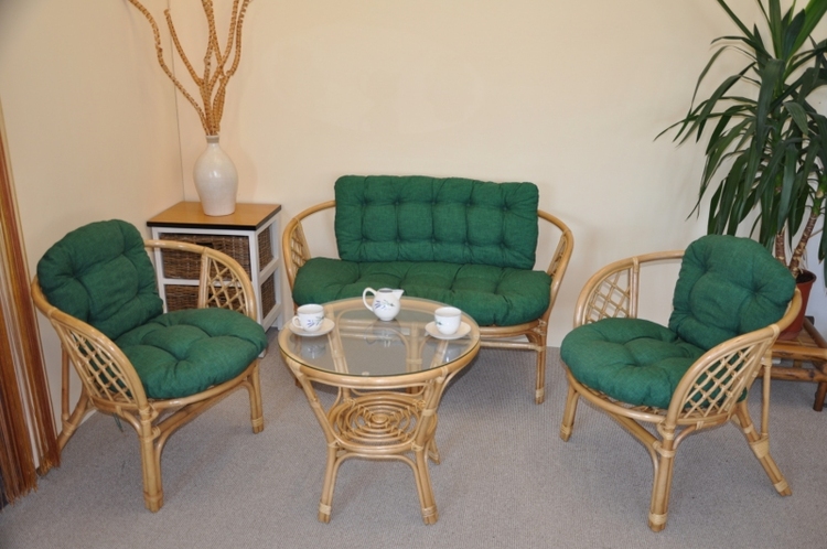 Ratanový nábytok – ratanová sedacia súprava Bahama je vyrobená z prírodného ratanu s farbou konštrukcie v medovom odtieni. Súprava obsahuje pohovku, 2 kreslá, stolík so sklom a kompletnú sadu veľmi kvalitných polstrov. | Farba ratanovej konštrukcie aj ratanového výpletu je medová. Veľkosť pohovky je 115×66×73 cm, nosnosť pohovky je 150 kg. Veľkosť kresla je 68×66×73 cm, nosnosť kresla je 110 kg. Výška sedu je 44 cm. Stolík má výšku 55 cm, priemer stolíka je 60 cm. Spoje ratanovej konštrukcie sú skrutkované. Polstre na túto sedaciu súpravu Bahama sú vyrobené v Českej republike. Polstre sú vyrobené z kvalitnej látky a vyznačujú sa vysokou kvalitou spracovania. Polstry pre nás vyrába firma AXIN Cuschions sro, ktorá zamestnáva výhradne miestne vyučené krajčírky z Českej republiky. Týmto spôsobom sa snažíme podporovať výrobu a zamestnanosť v našej republike. Náplň vankúšov je drvený molitan a podušky možno prať ručne na 40°C.