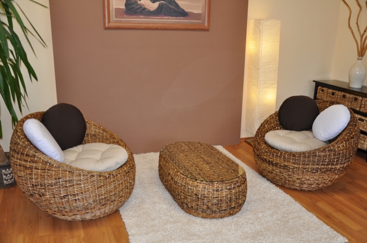 Sedacia súprava vyrobená z prírodného ratanu a výpletom z listov banánovníka pozostávajúca z dvoch kresiel, stolíka so sklenenou doskou a kompletnej sady polstrov. | Konštrukcia sedacej súravy je vyrobená z masívnych ratanových tyčí, výplet je tvorený zo zväzkov listu banánovníka v prírodnej hnedej farbe.