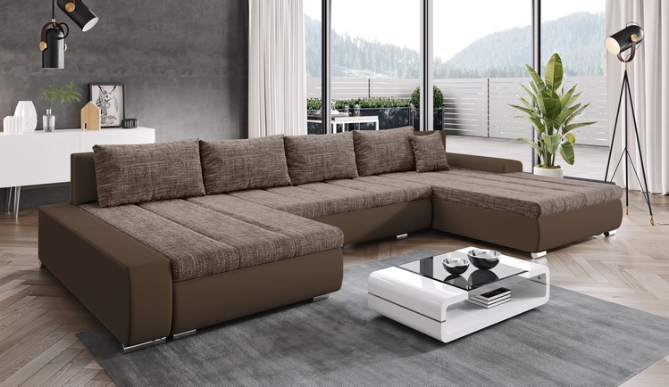 Praktická priestranná celočalúnená rohová sedačka do tvaru U v modernom prevedení. Sedačka obsahuje úložný priestor a priestor na príležitostní spanie. Po rozložení je spacie plocha 367 x 150 cm. Rozklad je ľahký, vysunie sa vozík s matracom do prednej časti. Pohodlné sedenie zaručujú vlnovcové pružiny spolu s PUR penou (T30). Výška sedu je 40 cm, hĺbka sedu 71 cm, výška sedačky bez vankúšov 73 cm. Nôžky sú kovové pochrómované. Farebné prevedenie - korpus je vyrobený z ekokože Madryt 124, sedacia časť a oporné vankúše sú z látky Berlin 03.CASA 41039