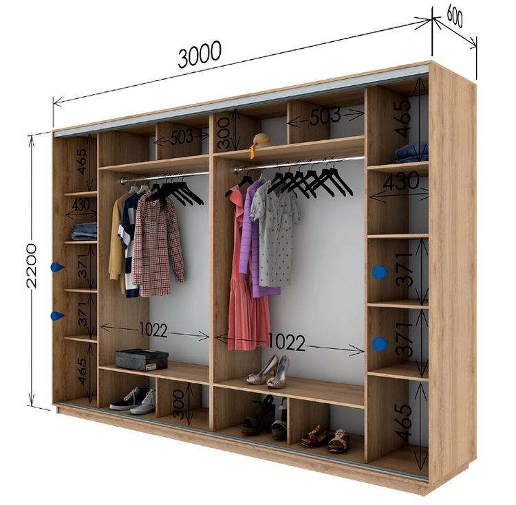 Šatníková skriňa s posuvnými dverami v modernom prevedení. Nezvyčajná výška 220 cm a šírka 300 cm Vám ponúkne skutočne veľký úložný priestor. Korpus aj dvere sú z kvalitnej LTD dosky vo farbe dub sonoma. Skriňa má alumíniové kovanie a lišty. Usporiadanie políc viď. obrázok. Dodávame v demontovanom stave. Možnosť dokúpenia praktického bočného regálu alebo zásuviek do vnútorného priestoru skrine (modrá farba na perokresbe naznačuje, kam je možné zásuvky umiestniť),oboje nájdete v našej ponuke.CASA 83068