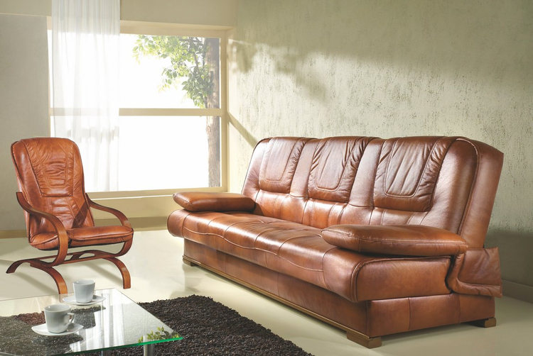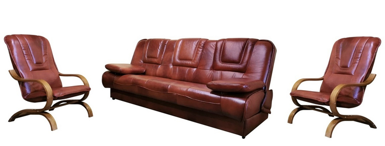 Elegantná sedacia súprava, ktorá svojim vzhľadom a prevedením zaručuje luxus a pohodlie. Prinášame Vám akčnú cenu za túto súpravu, ktorá obsahuje trojsedák a 2 kreslá. Trojsedák obsahuje praktický úložný priestor a je vyrobený z najkvalitnejšej pravej kože lícovej. Zadná strana je potiahnutá čiernou látkou, za príplatok je možné zaistiť sedačku celo-čalúnenú. Nohy sú vyrobené z masívneho dubového dreva s morením. Hĺbka sedu pri pohovke je 53 cm, výška sedu 41 cm. Kožený nábytok je nutné čistiť iba za pomocou špeciálnych prostriedkov na čistenie a konzerváciu prírodných koží, drevo treba čistiť suchou mäkkou handričkou, je možné tiež používať prostriedky na konzerváciu a ochranu dreva neobsahujúce silikón. Farebné prevedenie - pravá koža S42 a drevo rustikal (viď obrázok).CASA 33009