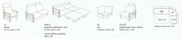 Základná cena je za zostavu E2RP + ER + E1UL + E1 = pohovka rozkladacia k rohu + roh + půlpohovka k rohu úložná + kreslo. Opierka hlavy nie je súčasťou ceny, cena za kus činí podľa poťahové látky 955-1130 Sk. Požiadavka na objednanie vrátane počtu kusov napíšte do poznámky v objednávke.
