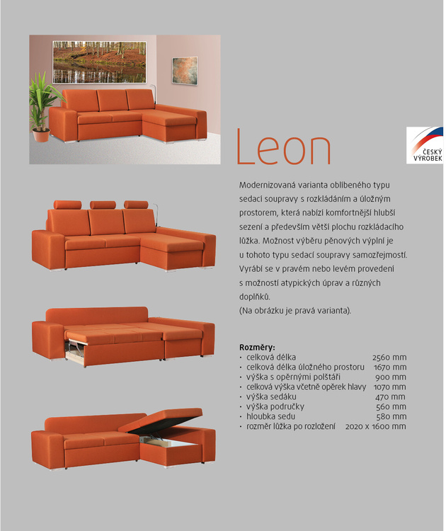 Modernizovaná varianta obľúbeného typu pevnej sedacie súpravy s úložným priestorom ponúka komfortnejšie hlbšie sedenie a predovšetkým väčšiu plochu rozkladacieho lôžka. Možnosť výberu penových výplní je u tohto typu sedacích súprav samozrejmosťou. Vyrába sa v pravom alebo ľavom prevedení s možnosťou atypických úprav a inštaláciou rôznych doplnkov.