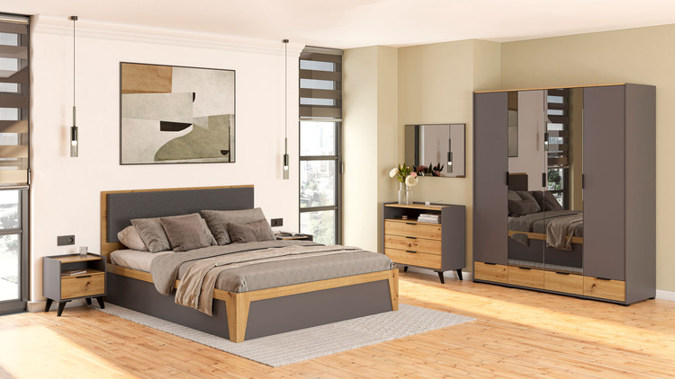 Nábytok do spálne predstavuje štýlovú kolekciu nábytku, ktorá umožní komfortné vybavenie spálne. Vysoká funkčnosť jednotlivých súčastí a atraktívny dizajn sú zárukou zákazníkovej spokojnosti. Jednotlivé prvky tejto kolekcie sa môžu pochváliť vysokou kvalitou prevedenia, precíznym. />Manželská posteľ je vyrobená v elegantnom modernom štýle. Čelo postele je vybavené mäkkým čalúnením v látke Bagheera 34. Rošt je v cene.