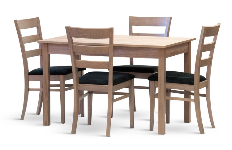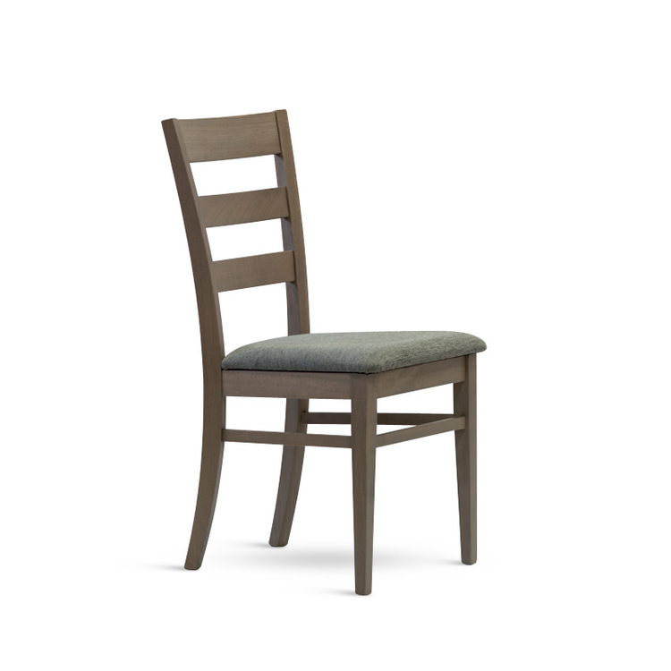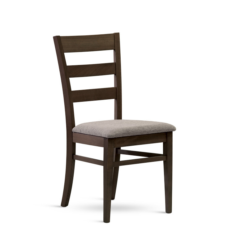 Jedálenská stolička s čalúneným sedákom. Novinka 2018 - ponúkame 5 základných odtieňov morenia a látky genézu, alebo výber z 78 zákazkových látok.