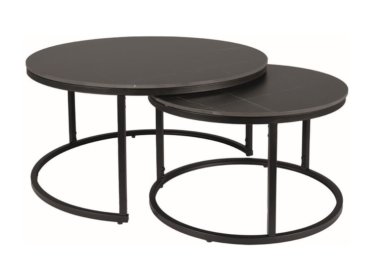 Súprava konferenčných stolíkov 2 ks v modernom štýle. Konštrukcia stolíkov je z kovu lakovaného čiernou farbou, vrchná doska je z keramiky vo farbe čiernej s efektom mramoru. Tento štýlový kúsok v jednoduchom dizajne je vhodný nielen do obývacej izby, ale aj do kancelárie, kaviarne, baru, čakárne či recepcie. Rozmery väčšieho stolíka sú 80x80x42 cm, rozmery menšieho 60x60x38 cm. Dodávame v demontovanom stave.CASA 12122
