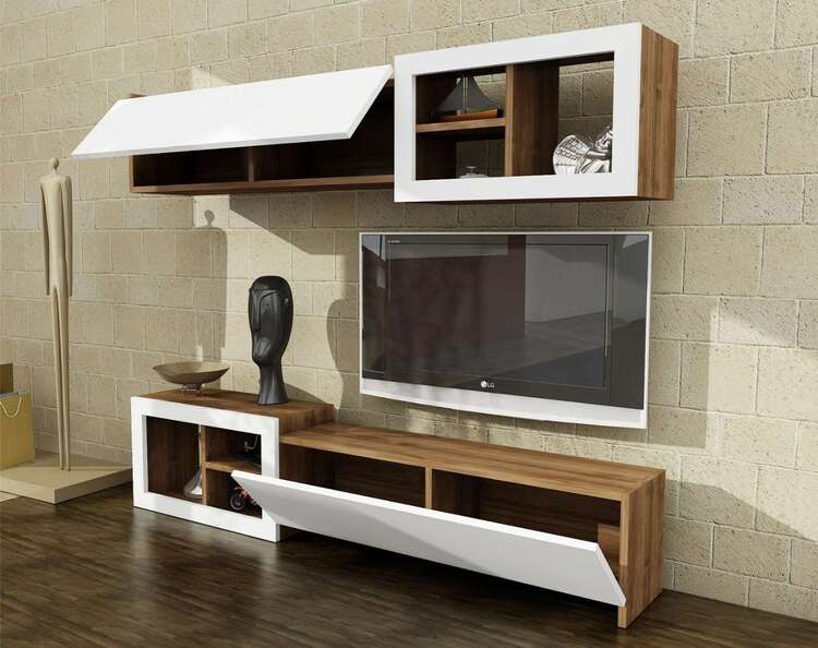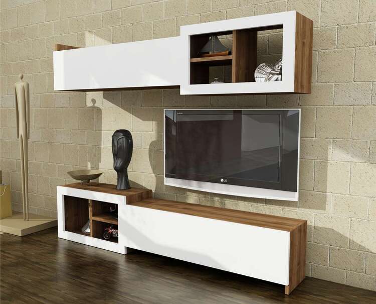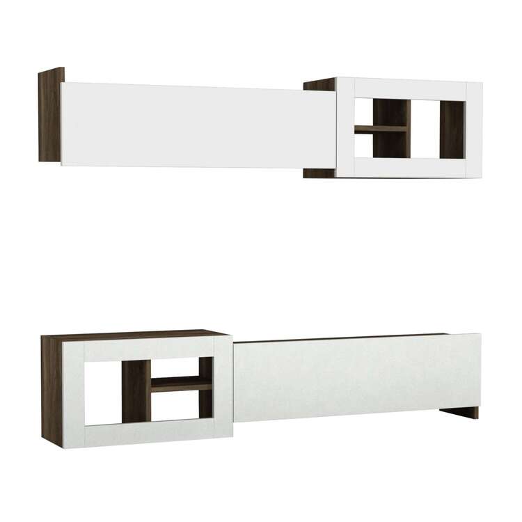Predstavujeme obývaciu stenu, ktorá prináša do vašej obývačky moderný a elegantný dizajn. Táto štýlová zostava v kombinácii bielej a orechovej farby je navrhnutá tak, aby poskytovala praktické a estetické riešenie pre vaše multimediálne zariadenia a ďalšie potreby.