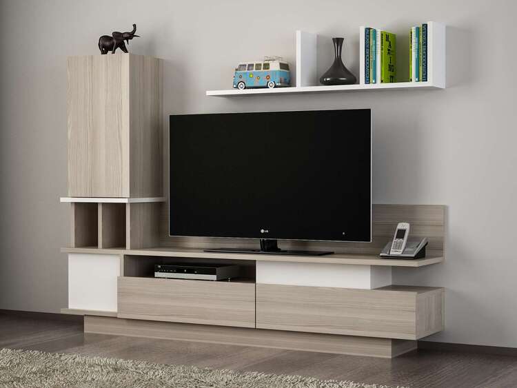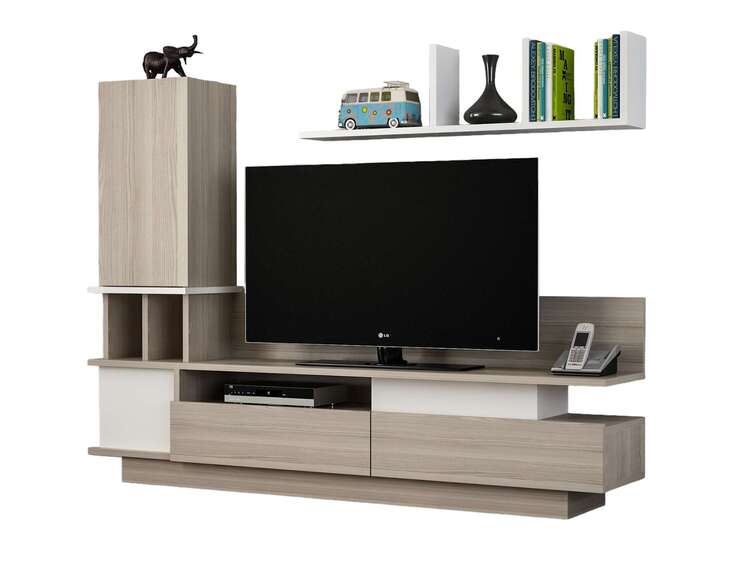 Predstavujeme obývaciu stenu, ktorá prináša do vašej obývačky moderný a elegantný dizajn. Táto vysoká a priestranná zostava v kombinácii bielej a svetlo hnedej farby je navrhnutá tak, aby poskytovala praktické a estetické riešenie pre vaše multimediálne zariadenia a ďalšie potreby.
