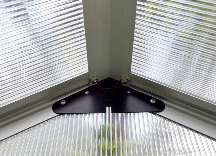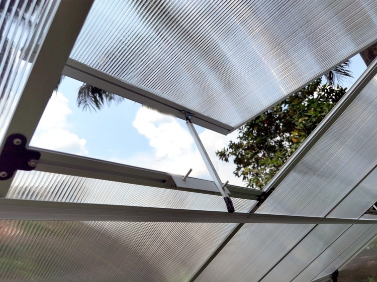 204cm Špeciálna drážková konštrukcia skleníkov VeGA je vyrobená z eloxovaných hliníkových profilov. Jedná sa o moderné dokonalé riešenie, ktoré zásadne zvýšilo celkovú pevnosť a stabilitu celého skleníku. Oproti zastaranému drátkovému systému, ktorý sa už takmer moc nepoužíva, sa zároveň zvýšila aj odolnosť skleníku voči nárazom vetra a snehové záťaži. Na presklenie je použité veľmi kvalitných tepelno-izolačných dvojstenných komôrkových polykarbonátových dosiek s hrúbkou 4 mm as UV slnečným filtrom. Tento polykarbonát prešiel nemeckú certifikovanú skúšobňou TUV Rheinland. Skleníkom tejto celého modelového radu VeGA je zdarma dodávaná masívna pozinkovaná základňa slúžiace pre bezproblémové používanie skleníka aj bez pevného základu. Výška skleníka so základňou 201-207 cm je koncipovaná pre bežných európskych užívateľov.
