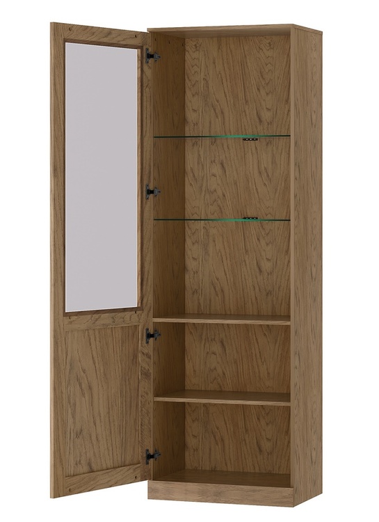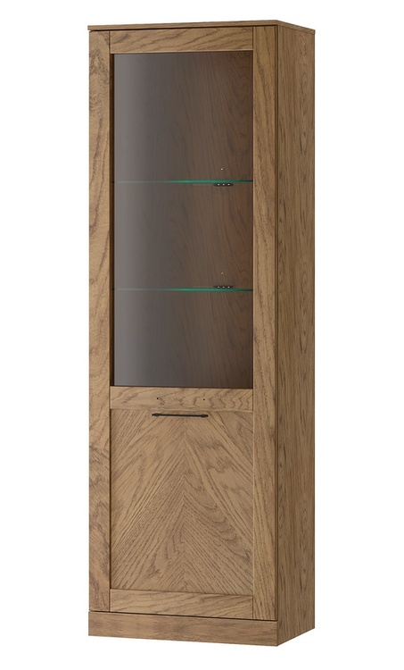 Vitrína jednodverová v nadčasovom prevedení. Korpus je vyrobený z prírodnej dyhy vo farbe dub rustikálny, dvierka sú vyrobené z masívu v kombinácii s prírodnou dyhou v zaujímavom dekore rybia kosť v prevedení dub rustikálne olejovaný. Súčasťou vitríny je aj LED osvetlenie. Úchyty sú kovové vo farbe čierna mat. Dvierka disponujú systémom tichého dovierania. Dodávame už v zmontovanom stave.CASA 75098