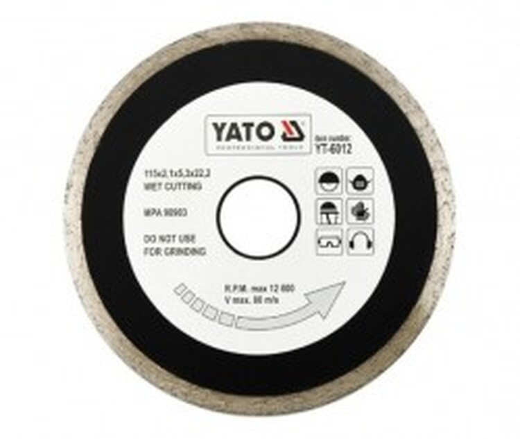 YATO YT-6012 Náradie Kotúč diamantový pre mokré rezanie s použitím na keramiku sklo a porcelán Technické údaje priemer 115 mm otvor 222 mm max otmin 1