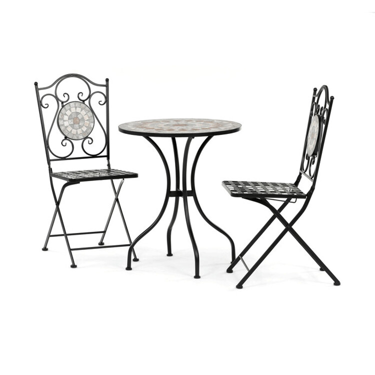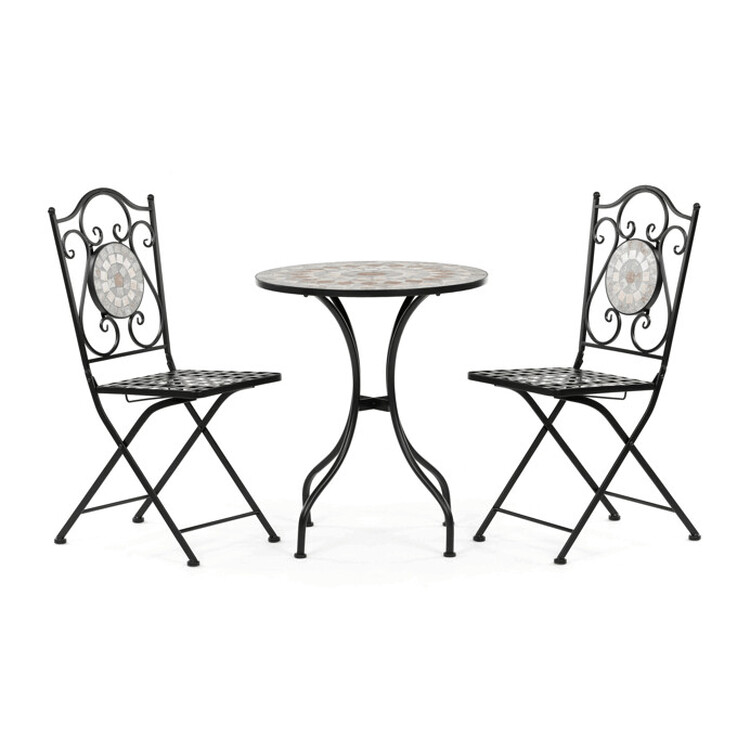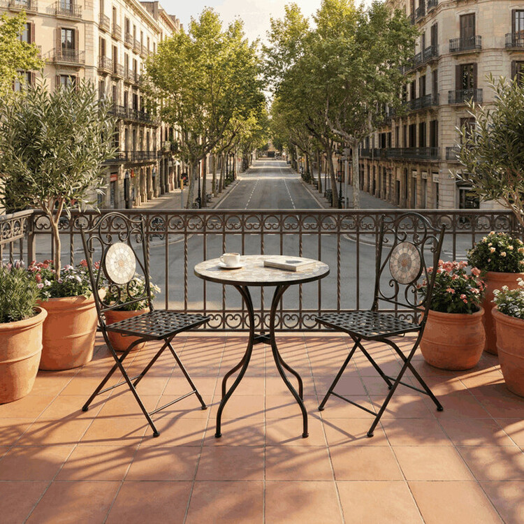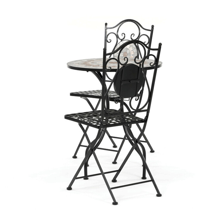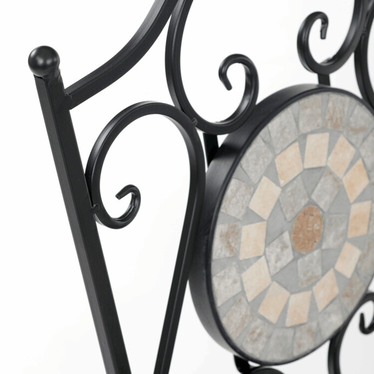 Záhradný set US1400 sa skladá z okrúhleho stola a dvoch stoličiek s pevnou kovovou konštrukciou v čiernom prevedení. Doska stola je vyrobená z keramickej mozaiky, ktorá kombinuje prírodné odtiene a vytvára dekoratívny vzor s dlhou životnosťou a jednoduchou údržbou. Stoličky majú sedáky s mriežkovým vzorom a operadlá zdobia keramické kruhové vložky, ktoré ladia s dizajnom stola. Stabilná kovová podnož zaisťuje pevnosť a odolnosť setu, vhodného na použitie na balkónoch aj záhradách. Kompaktné rozmery umožňujú pohodlné usadenie dvoch osôb a prispievajú k praktickému využitiu priestoru.