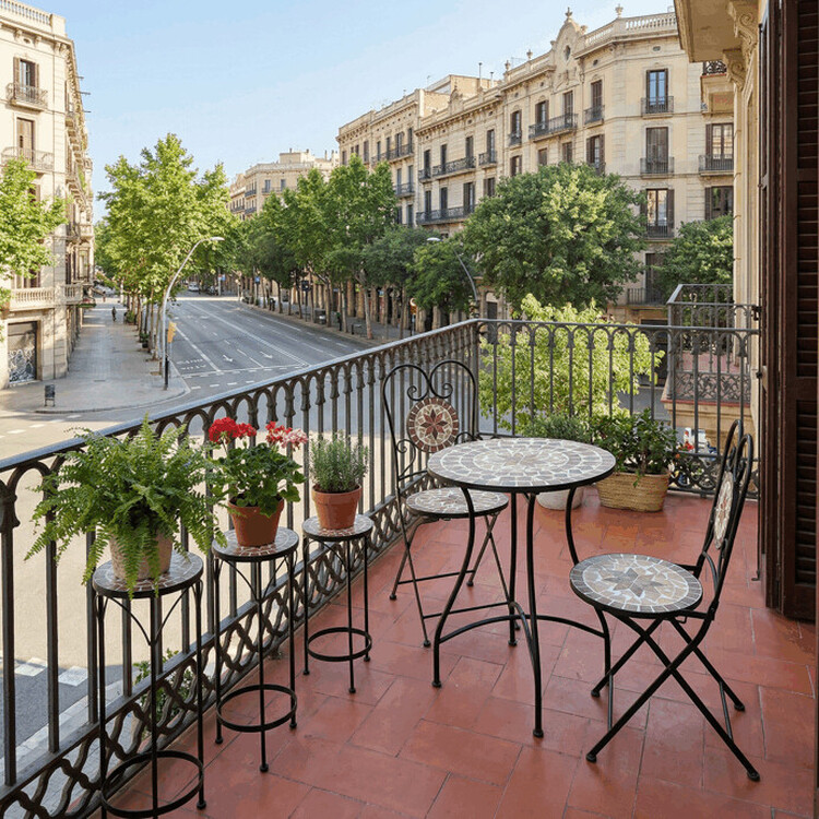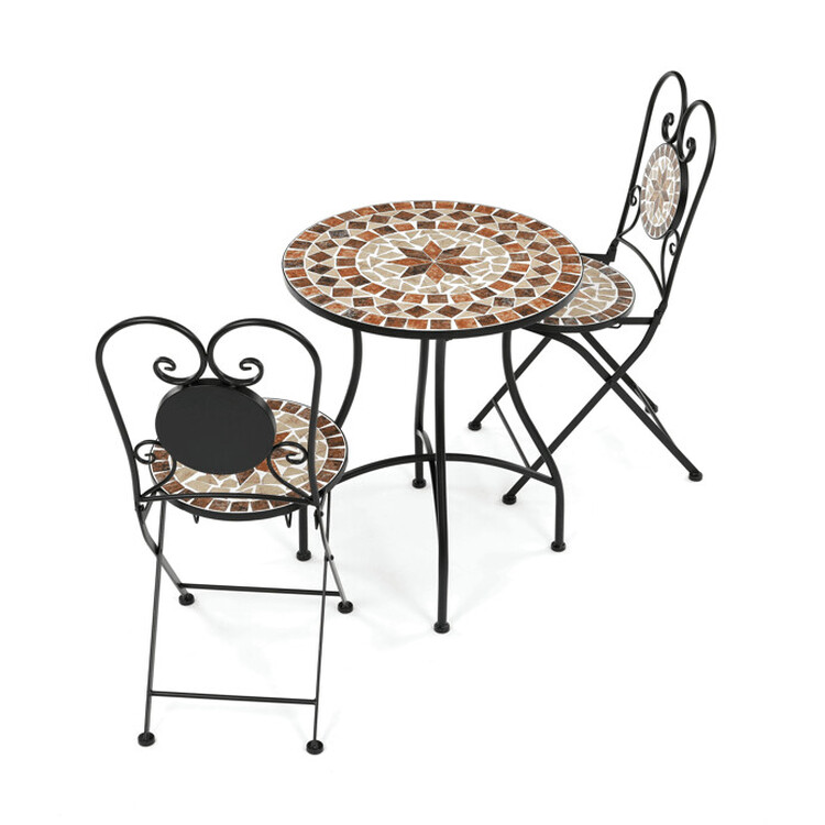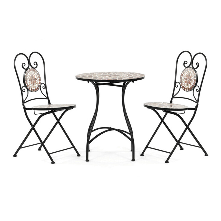 Záhradný set pozostávajúci z okrúhleho stola a dvoch stoličiek kombinuje pevnú kovovú konštrukciu s dekoratívnou keramickou mozaikou na doskách. Kovové nohy stola aj stoličiek sú tvarované do elegantných oblúkov a zdobené jemnými kovanými detailmi, ktoré dodávajú celku ľahkosť a stabilitu. Keramická mozaika v prírodných a teplých odtieňoch vytvára výrazný vizuálny efekt a zároveň je ľahko udržiavateľná. Set je vhodný na vonkajšie použitie na balkónoch či terasách, kde poskytuje pohodlné posedenie pre dve osoby. Vďaka kombinácii materiálov je navrhnutý pre dlhú životnosť a odolnosť voči poveternostným vplyvom.