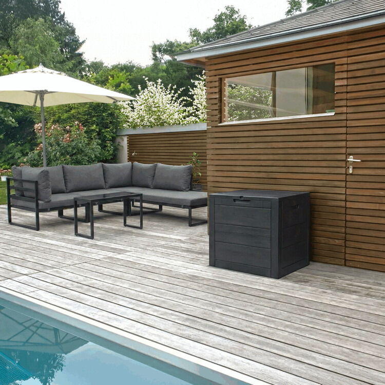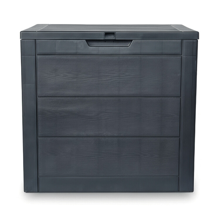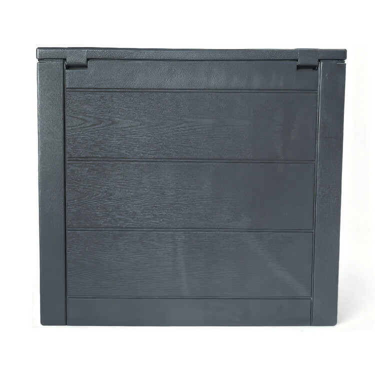 Záhradný úložný box v antracitovej farbe je vyrobený z odolného plastu, ktorý sa ľahko udržuje a je vhodný pre vonkajšie použitie. Priestranný interiér s objemom 120 litrov ponúka dostatok miesta na uskladnenie záhradného náčinia, vankúšov alebo ďalších doplnkov. Box má pevné veko s integrovanou úchytkou na jednoduché otváranie a praktické bočné úchyty pre pohodlnú manipuláciu. Jeho dizajn s textúrou pripomínajúcou drevo dodáva záhrade moderný a zároveň prirodzený vzhľad. Kompaktné rozmery umožňujú umiestnenie na terasu, balkón aj do záhradných zákutí.